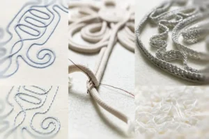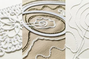 Rolled stitch, back cord stitch, frill stitch can be accessed by changing the individual sewing pattern with optional guide.