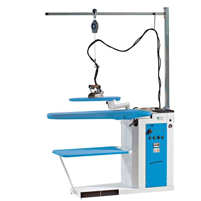 Ironing board with vacuum, heating and steaming options with iron unit to be connected to a steam source