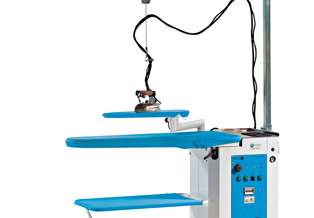 Ironing board with vacuum, heating, steaming and blowing options with iron unit to be connected to a steam source