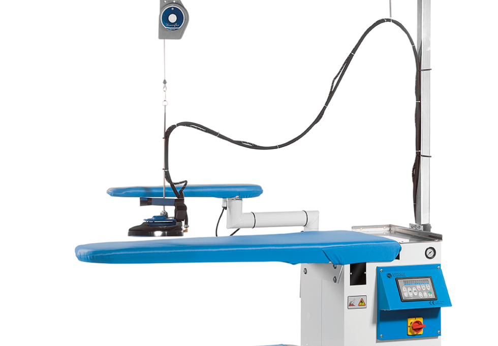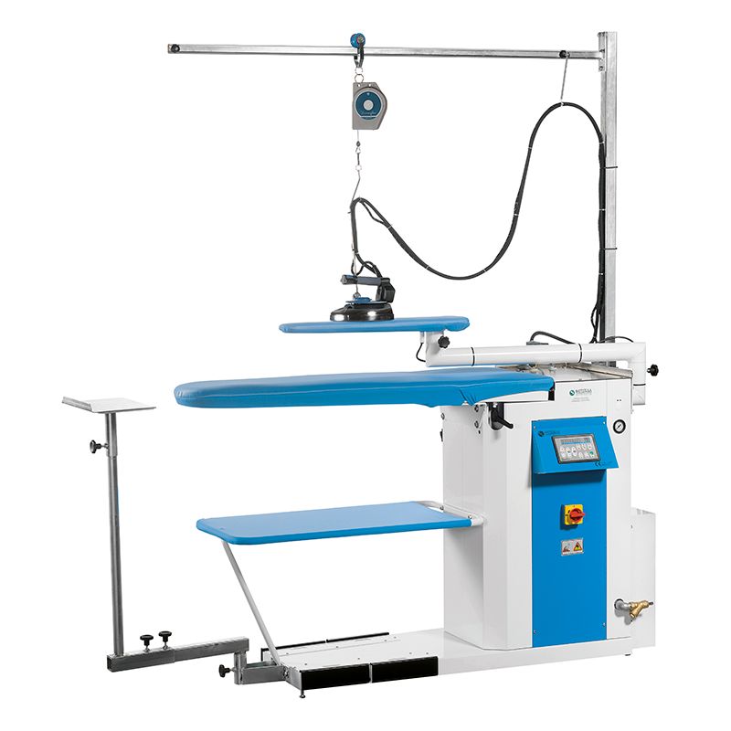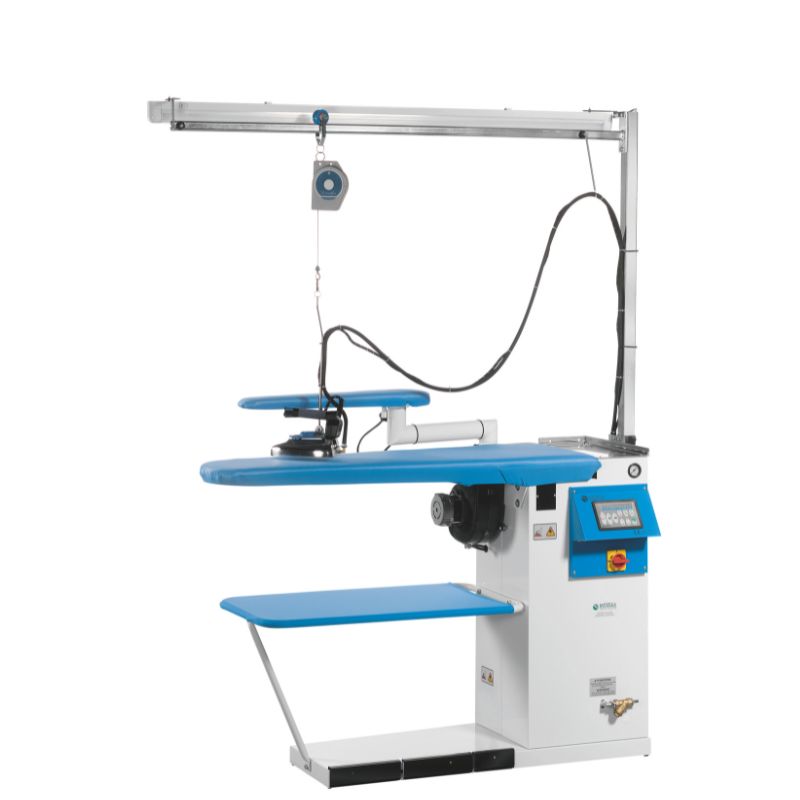 Ironing board with vacuum, heating, steaming and blowing options, with iron and boiler