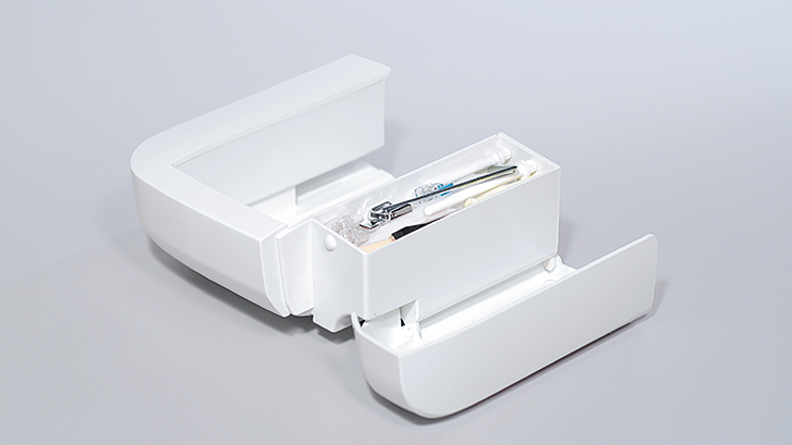 The Auxiliary Box slides off for the free arm sewing. Also, standard accessory parts can be neatly stored in the Auxiliary Box.