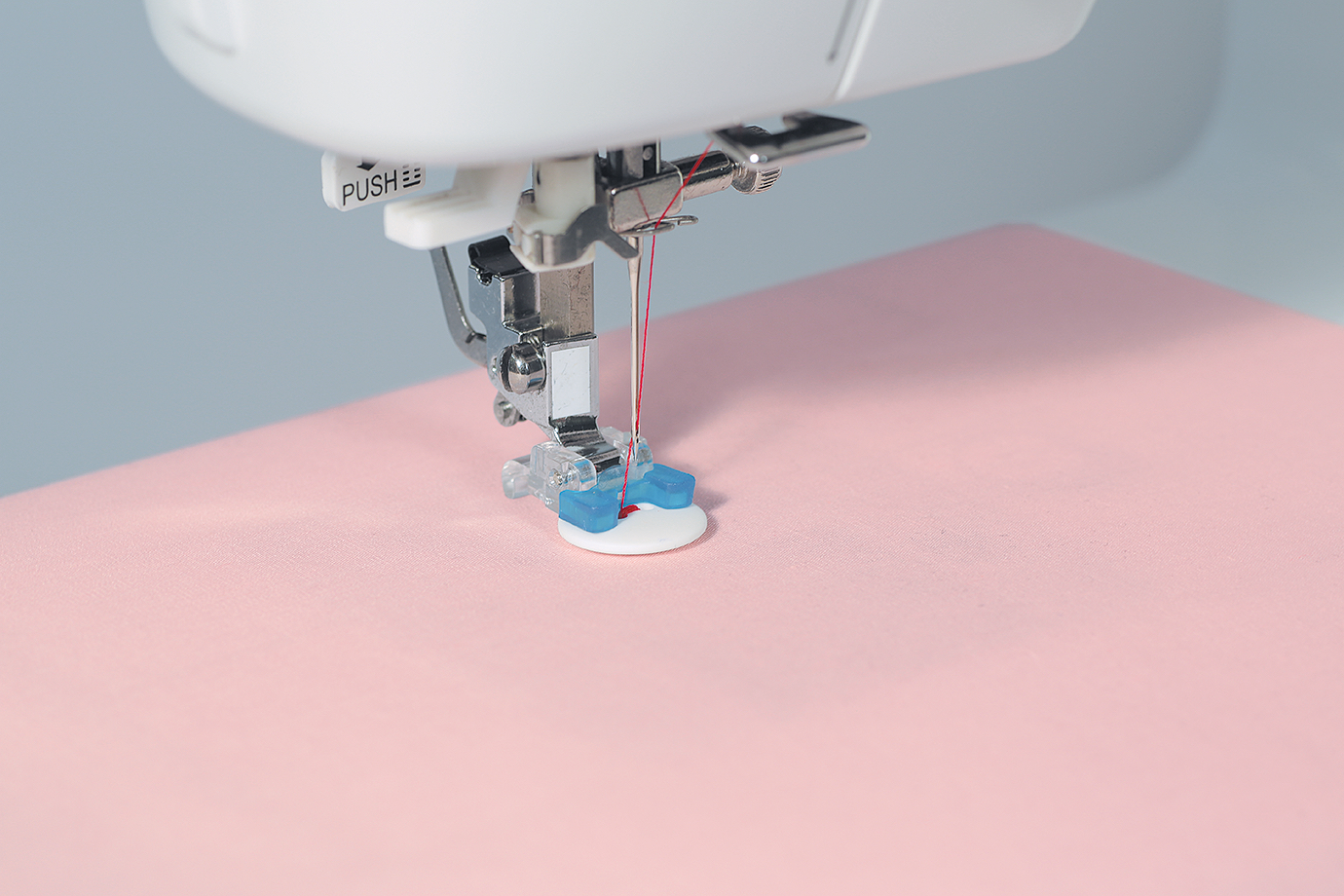 By placing button on the buttonhole foot, the machine conveniently sews buttonholes automatically according to the size of the button.