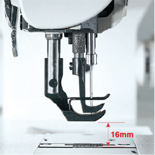 The amount of the alternating vertical movement of the walking foot and presser foot can be adjusted up to the maximum of 6.5mm according to the height of multilayered portions of material.