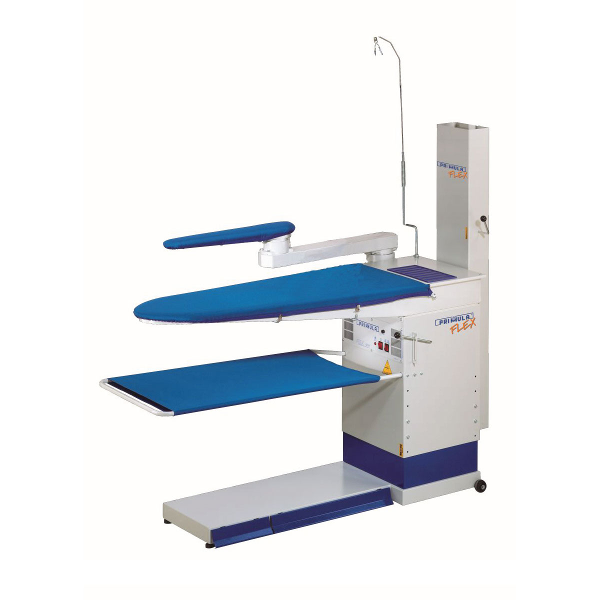 The Primula Flex DOB Ironing Table is available in two advanced models. The Flex DOB model includes heating and suction functionality. The Flex DOB S+B model adds automatic suction and blowing transition. Two foot pedals control airflow changes instantly. This feature increases efficiency and user control. Both models include professional accessories. The package contains an ATB swivel bow and silicone iron rest pad. A spill tray, kicker plate, chimney, and wheels ensure clean operation and easy movement. Extra accessories provide full customization. Options include swivel arm, buck, Vario system, lighting system, steam iron, and iron gantry.