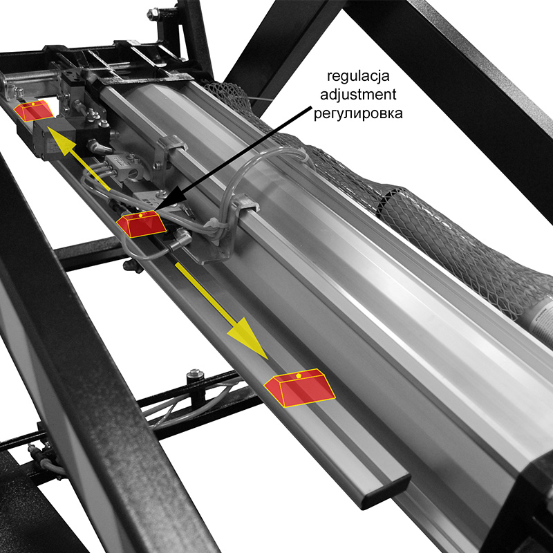 The table is equipped with a carpet-covered tabletop with sliding rails and a hydraulic anti-bouncing brake system that helps to prevent the table from bouncing. The table has a Height Positioning System: when one presses a pedal, the table starts to move, making a 2 seconds pause at a certain point of movement. The height of this pause can be adjusted on a special bar placed under the table. This solution allows upholsterer to work at a comfortable height and eliminates the need of time-consuming adjustments of the height of the table.