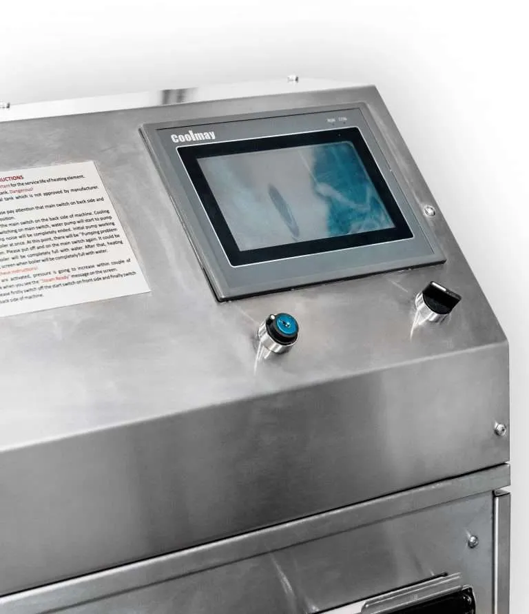 Steam cleaning machine in stainless steel. It is ideal for the industrial sector, thanks to its high power that allows it to provide more than 1250 grams of steam per minute. It is equipped with an external vacuum function and a PLC touch screen.